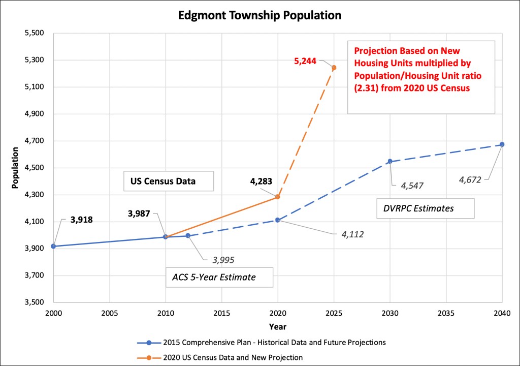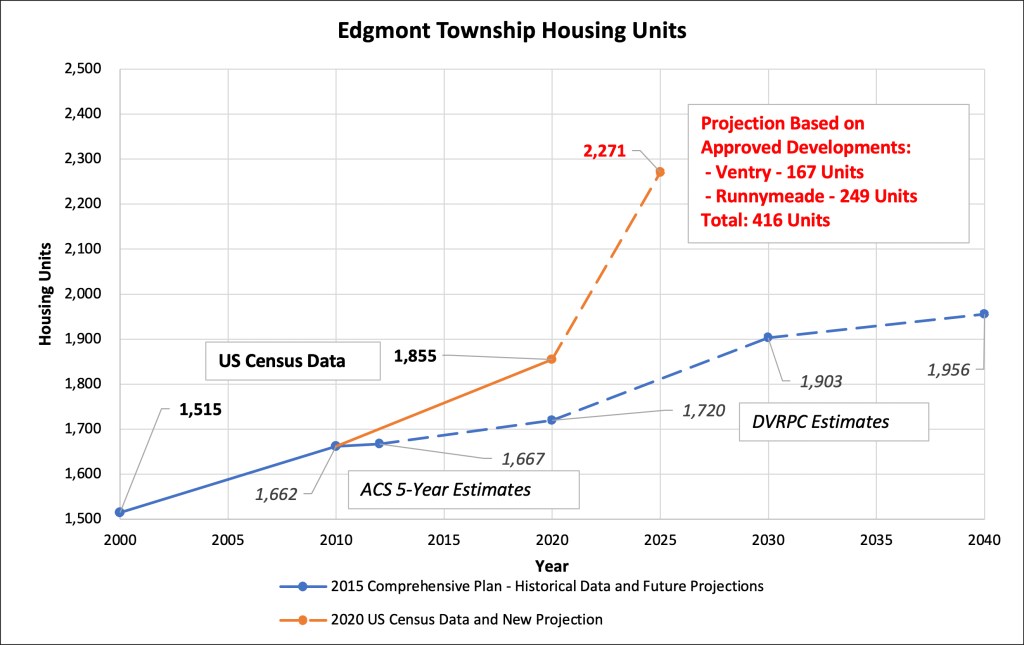 Similarly, using Edgmont’s population to housing ratio from the 2020 Census, it is possible to project that when Runnymeade and Ventry are complete, Edgmont Township’s total population will have increased by 31.5% (1257 people) since 2010. By comparison, the Comprehensive Plan estimated a total population growth of 17.2% (685 people) by the year 2040.