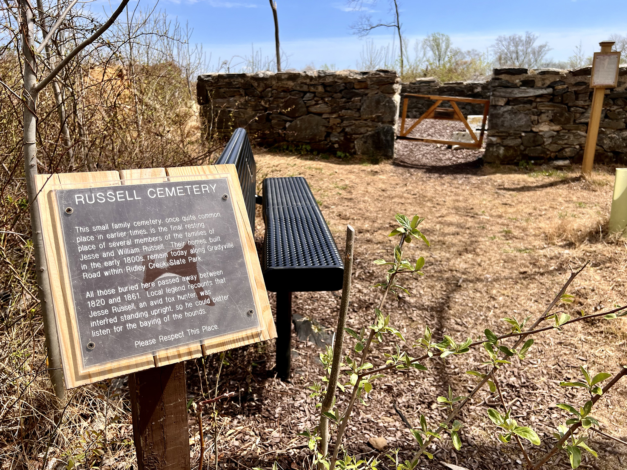 We’ll meet near the Stables, then hike north to cross under Gradyville Road and access the bridle trails. We’ll parallel Ridley Creek, see some of the damage caused by the Halloween 2019 tornado, and visit the 19th-century Russell Cemetery, where rumor has it one avid fox hunter was buried standing up so he would still be able to hear the baying of the hounds from his resting place high atop the aptly named Hunting Hill.